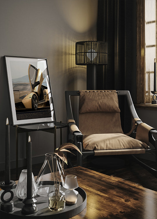Gros plan impressionnant de l'emblématique Lamborghini Reventón, dans une élégante finition dorée. Les portes en élytre s'ouvrent pour révéler le design agressif et futuriste de la voiture, sur un magnifique fond de montagnes. Idéal pour les passionnés de supercars, les amateurs de luxe et les amateurs de décoration inspirée de l'automobile.