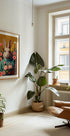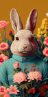 Une affiche imaginative et charmante avec un lapin dans une veste turquoise entouré de fleurs épanouies. La composition ludique combine illustration vintage et fantaisie surréaliste, parfaite pour la chambre d'enfant, la salle de jeux ou pour tous ceux qui aiment les portraits d'animaux humoristiques.