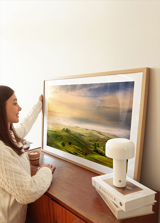 Podere Belvedere's Sunrise par Arnaud BRATKOVIC - Papier de qualité supérieure avec une surface mate lisse et un toucher élégant. La finition mate réduit l'éblouissement et donne un look raffiné et intemporel. Solide et durable pour une utilisation durable, idéal aussi bien pour les environnements professionnels que pour les affichages décoratifs.