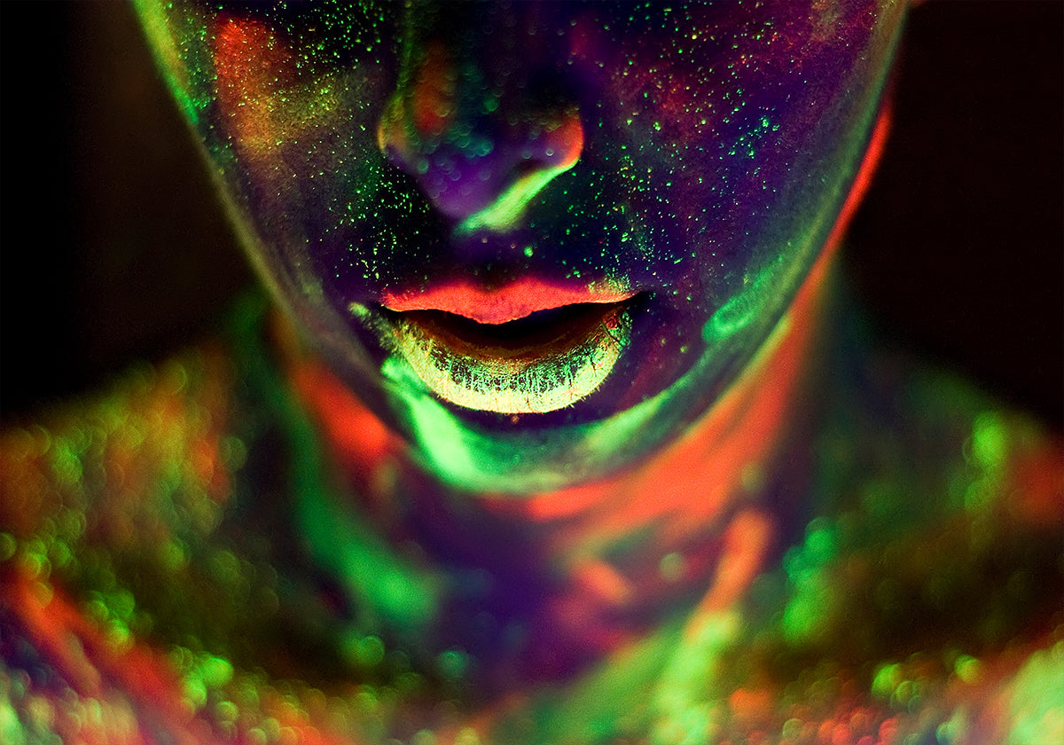 Un portrait saisissant qui brille sous la lumière UV, où les couleurs néon transforment le visage en une toile cosmique. Des verts vibrants, des rouges ardents et des jaunes brillants illuminent la peau et créent un mélange surréaliste de mystère et d'intensité. Cette œuvre d'art audacieuse célèbre la couleur, la lumière et la force humaine.