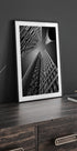Une scène urbaine monochrome d'Amsterdam avec des perspectives spectaculaires, où des tours et des mâts élancés jaillissent vers le ciel. Les lignes graphiques et les contrastes marqués créent du rythme et du calme en même temps que la lumière estivale dessine les façades. Une ambiance moderne et urbaine dépeinte par l'artiste willem. Parfait pour les amoureux de l'architecture et de la vie citadine.