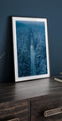 Une route hivernale solitaire traverse une forêt de pins sombre, enveloppée de brume et de lueur bleuâtre. Au loin, les phares des voitures brisent le silence et conduisent le regard vers l'horizon, là où la neige et la brume se rencontrent. La symétrie serrée et le calme mélancolique capturent l’envie du voyage. Photographie d'Oskar Ulvur. Parfait pour ceux qui aiment les paysages hivernaux tranquilles.