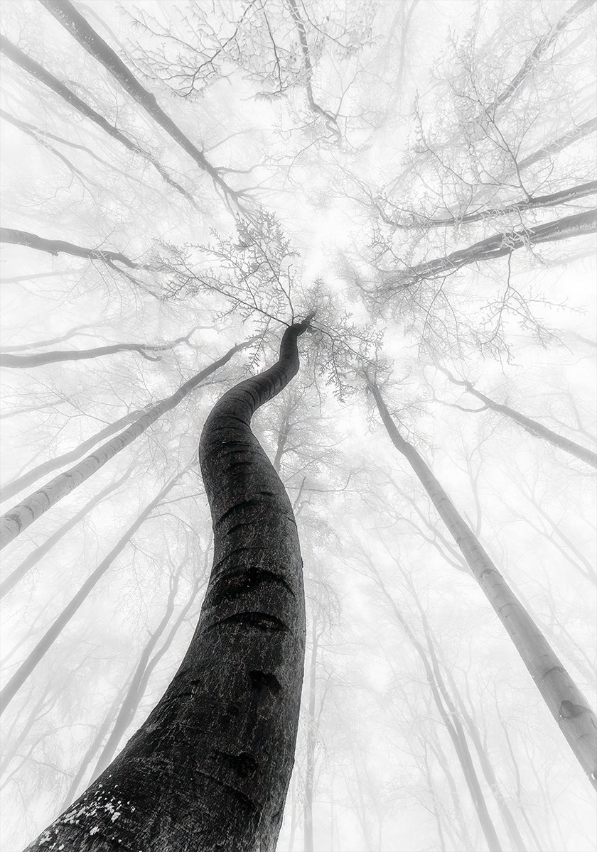 Un moment hivernal tranquille capturé par le photographe Tom Pavlasek : de minces hêtres se dressent dans la neige, enveloppés de brouillard et de givre. Les tons doux de gris et de blanc créent de la profondeur et du calme, tandis que les tensions répétées dessinent des lignes graphiques dans le paysage. Une ambiance minimaliste et nordique pour la maison. Parfait pour les pièces recherchant clarté, silence et nature.