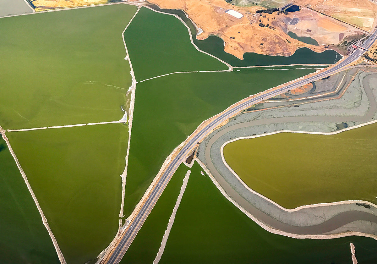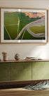 Une superbe photographie aérienne du paysage de la baie de San Francisco, où les routes sinueuses, les ruisseaux et les champs verts forment des motifs géométriques distincts. Capturée d'en haut, cette œuvre d'art met en valeur la beauté des frontières entre la nature et la création humaine, ce qui en fait un art mural photographique moderne.