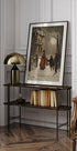 Une affiche vintage d'ambiance célébrant La Bohème de Giacomo Puccini : une soirée d'hiver sous la neige et au clair de lune, où un petit groupe se rassemble devant la façade du théâtre. Les accents rouges brisent le froid, les silhouettes des arbres encadrent la scène et le chant, l'amitié et la poésie de la grande ville se ressentent dans l'illustration historique. Un hommage à la romance, à la magie de l'opéra et à la poésie hivernale.