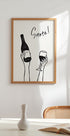 Mains tenant une bouteille de vin et un verre de vin avec le texte « Cheers ! » en français Poster