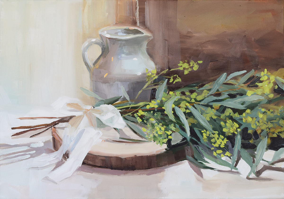Une charmante nature morte représentant une cruche rustique avec un feuillage délicat et des fleurs jaunes disposées à côté. L’œuvre d’art capture une atmosphère chaleureuse et intemporelle avec ses coups de pinceau picturaux, ses tons sourds et ses contrastes doux. Parfait pour créer une ambiance cosy d’inspiration vintage.