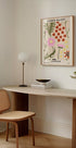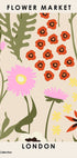 Une affiche saisissante inspirée du style Mid-Century avec des fleurs graphiques en rouge, rose et jaune sur fond beige. Représentant les marchés aux fleurs animés de Londres, il allie style rétro et charme botanique.