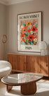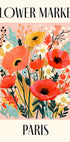 Une charmante affiche de style vintage avec des coquelicots vibrants, des fleurs sauvages et des couleurs pastel douces. L'affiche célèbre l'élégance des marchés aux fleurs de Paris et allie l'esthétique du voyage rétro à la beauté botanique.