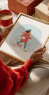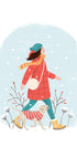 Winter Walk de Petra Holíková capture un moment calme un jour de neige : une femme vêtue d'un manteau bleu et d'une écharpe rouge promène son chien heureux tandis que de fins flocons de neige dansent dans les airs. Les accents de rouge chaud sur les tons bleus froids créent une atmosphère hivernale poétique, pleine de calme, de présence et de magie du quotidien.