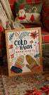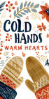 Cette image montre une illustration d'hiver confortable et chaleureuse avec le texte « Mains froides, cœurs chauds » au milieu. Autour du texte se trouvent des fleurs, des feuilles et de petits éléments décoratifs peints dans des tons chauds de rouge, d'orange et d'or combinés à des nuances de bleu froid. En bas, vous pouvez voir deux mitaines aux motifs et couleurs différents, qui soulignent l'atmosphère hivernale. L’impression générale est chaleureuse, digne de Noël et pleine de douceur hivernale.