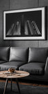 Et dramatisk sort-hvidt bybillede fra Madrids finansdistrikt: Fem slanke tårne rejser sig som moderne monolitter mod himlen, hvor lys og skygge skærer skarpe linjer mellem glas og stål. En rolig, geometrisk komposition, der fanger storbyens energi – signeret Enrique Rodriguez de Mingo. En hyldest til nutidig arkitektur og byens puls.