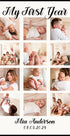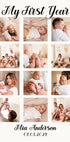 Une belle affiche bébé personnalisée célébrant la première année de vie de votre tout-petit. Ce collage photo capture douze souvenirs précieux, des moments de la naissance aux premières étapes. Un souvenir intemporel et le cadeau parfait pour les parents, les grands-parents ou la décoration d'une chambre d'enfant.