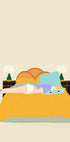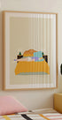 Une illustration humoristique et minimaliste d’une femme allongée épuisée sur un lit, la tête posée sur un ordinateur portable. Cette œuvre d'art ludique capture le style de vie numérique moderne et l'équilibre entre repos et productivité, ce qui en fait un ajout amusant aux espaces modernes.