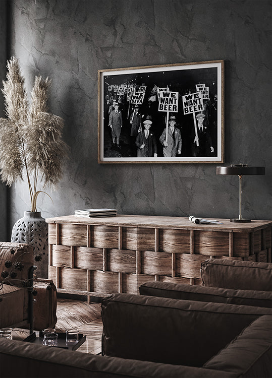 Une remarquable photographie vintage en noir et blanc immortalisant une manifestation historique à l'époque de la Prohibition. Les manifestants brandissent des pancartes sur lesquelles est inscrit « Nous voulons de la bière », symbole fort de la demande d'alcool du public au début du XXe siècle. Idéale pour les passionnés d'histoire, de photographie vintage et de décoration de bar originale.