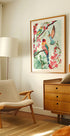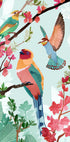 Une illustration vivante et tropicale d’oiseaux colorés assis et volant parmi des branches et des fleurs luxuriantes. Avec de fortes nuances de vert, de rouge et de bleu, l'œuvre d'art capture la joie et la vitalité de la faune estivale. Parfait pour ajouter une touche fraîche et exotique à n'importe quelle pièce.