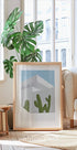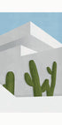 Une esthétique moderne du désert prend vie dans cette illustration minimaliste avec de grands cactus verts encadrés par des lignes architecturales épurées et un ciel bleu calme. L’interaction entre la lumière, l’ombre et la géométrie capture un moment ensoleillé dans une cour – une affiche saisissante pour les intérieurs modernes et inspirés de la nature.