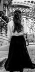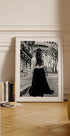 Une gracieuse photographie en noir et blanc d'une femme marchant sous la Tour Eiffel, vêtue d'une jupe fluide et les cheveux attachés par un nœud, évoque le charme parisien et l'élégance intemporelle. Capturant le romantisme des rues et de la mode de Paris, cet imprimé constitue une déclaration enchanteresse pour les intérieurs inspirés par le voyage, le style et la sophistication.