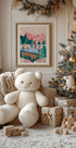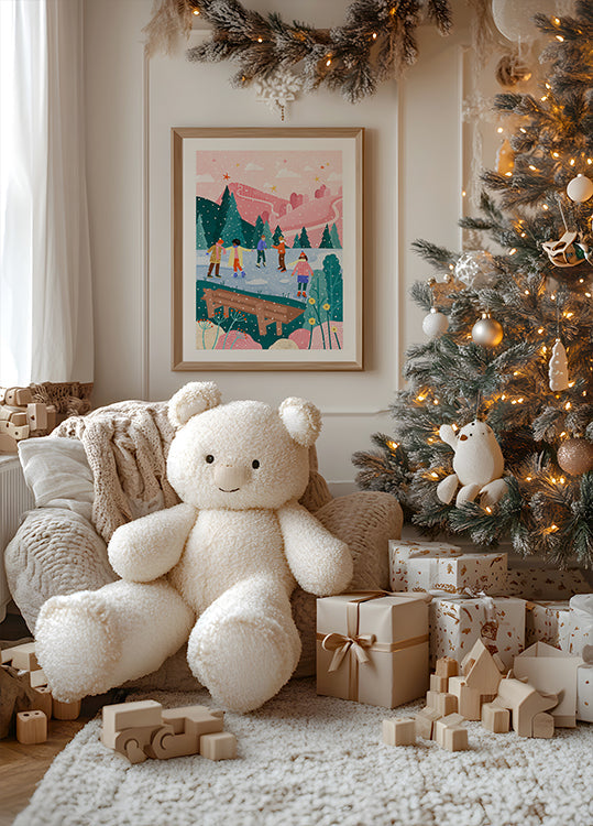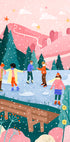 Un motif hivernal ludique de Bea Müller : sur un lac gelé, enfants et adultes patinent autour d'un sapin de Noël décoré pendant que les flocons de neige dansent dans les airs. L’arrière-plan révèle des montagnes douces et des épicéas sombres qui encadrent l’atmosphère festive. Les couleurs sont chaudes et vives, pleines de magie hivernale. Un hommage à la famille, à la communauté et à la joie de la saison.