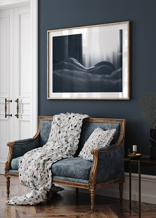 Ce paysage corporel monochrome évocateur capture les courbes sensuelles du corps féminin baigné par la douce lumière de la fenêtre. Le jeu subtil entre ombres et lumière met en valeur l'élégance figurative et crée une œuvre d'art raffinée qui allie intimité, sensualité et sophistication artistique.