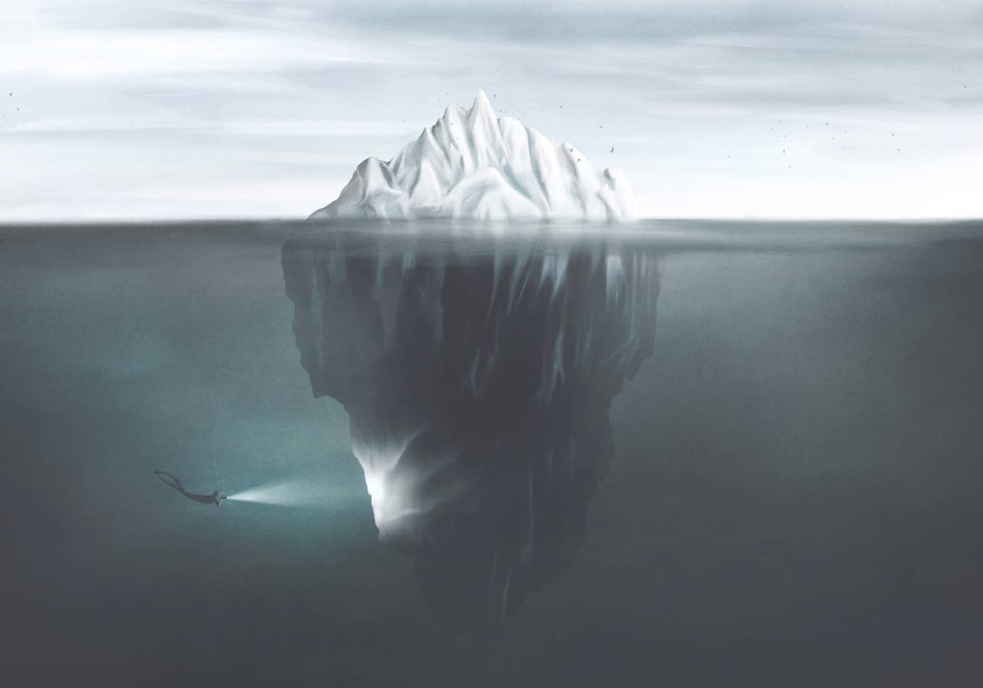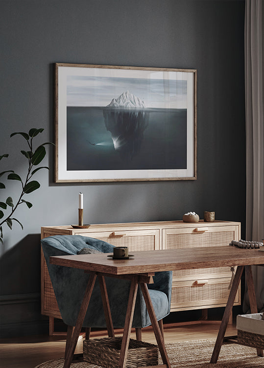 Une œuvre d'art stimulante représentant un iceberg aux profondeurs cachées sous la surface de l'eau, où un plongeur solitaire explore l'océan. Ce motif symbolise le potentiel caché, l'effort invisible et la profondeur du savoir souvent méconnue. Idéal pour les bureaux, les studios de création ou les environnements inspirants, il rappelle visuellement ce qui se cache derrière le succès.