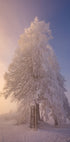 Une paisible matinée d’hiver se déroule dans un paysage baigné de lumière dorée du matin. Le givre scintille sur l’herbe et les branches, tandis que la silhouette d’un arbre solitaire se détache nettement sur le ciel clair. La neige étouffe toute trace et l'air tremble de froid et de calme. La photographie a été réalisée par Judith Kuhn. Les rayons du soleil traversent les branches qui riment et confèrent au motif un calme poétique.