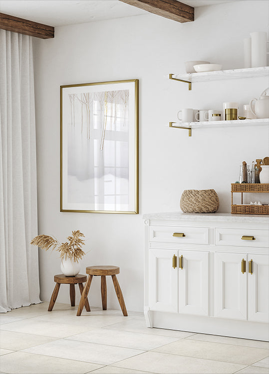 Winter Reflection de Laurentiu Pavel capture le calme hivernal nordique : des arbres nus se dressent comme des silhouettes graphiques le long des berges, se reflétant parfaitement dans une eau glacée. L'atmosphère lumineuse et bien éclairée et la palette limitée de tons blancs et gris créent du calme, de l'harmonie et une profondeur méditative dans la pièce. Un paysage hivernal poétique qui invite à la contemplation.