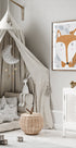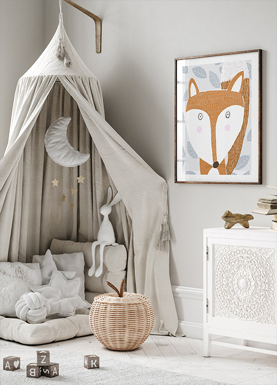 Un joli renard roux se dresse au milieu d’un paysage hivernal stylisé, entouré de motifs de feuilles grises qui forment un motif nordique calme. Les tons rouges chauds contrastent avec les tons gris froids et créent une atmosphère cosy et graphique avec une expression ludique. Créé par l'artiste Carla Daly – parfait pour les chambres d'enfants et la décoration nordique.
