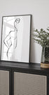 Un dessin au trait minimaliste d’une femme vue de dos, réalisé avec des lignes noires fluides sur un fond blanc clair. Cette œuvre d'art figurative abstraite met l'accent sur la simplicité, l'élégance et la forme et est idéale pour les intérieurs modernes et minimalistes.