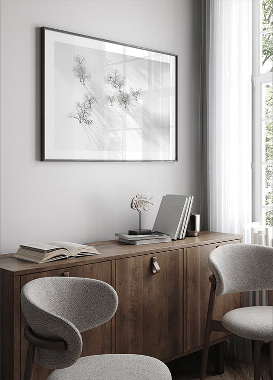 Rêve d'hiver – un ballet immobile de LINGLING GUAN dépeint un paysage hivernal tranquille, où la neige se dépose comme un léger voile autour des arbres élancés. Des tons sourds et un éclairage doux et frais créent un calme poétique qui invite à la contemplation – un ballet visuel de silence et d’élégance. Parfait pour faire entrer la poésie de l'hiver dans le salon.