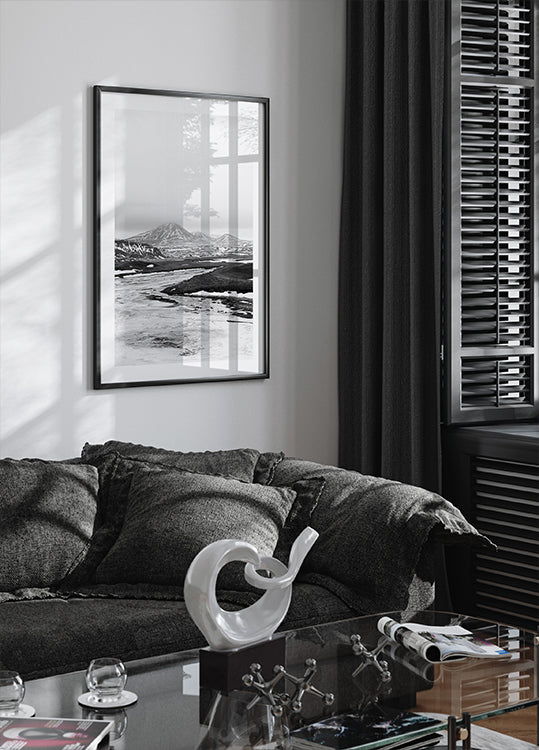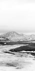 Un paysage graphique en noir et blanc de Lynann Colligan : une rivière islandaise gelée serpente à travers la toundra vers des montagnes lointaines sous un ciel vaste et immobile. Les contrastes entre les fissures de la glace et les surfaces douces de la neige créent profondeur et calme, avec un minimalisme nordique et une poésie hivernale brute. Un regard intemporel et monochrome sur le pouvoir de la nature.