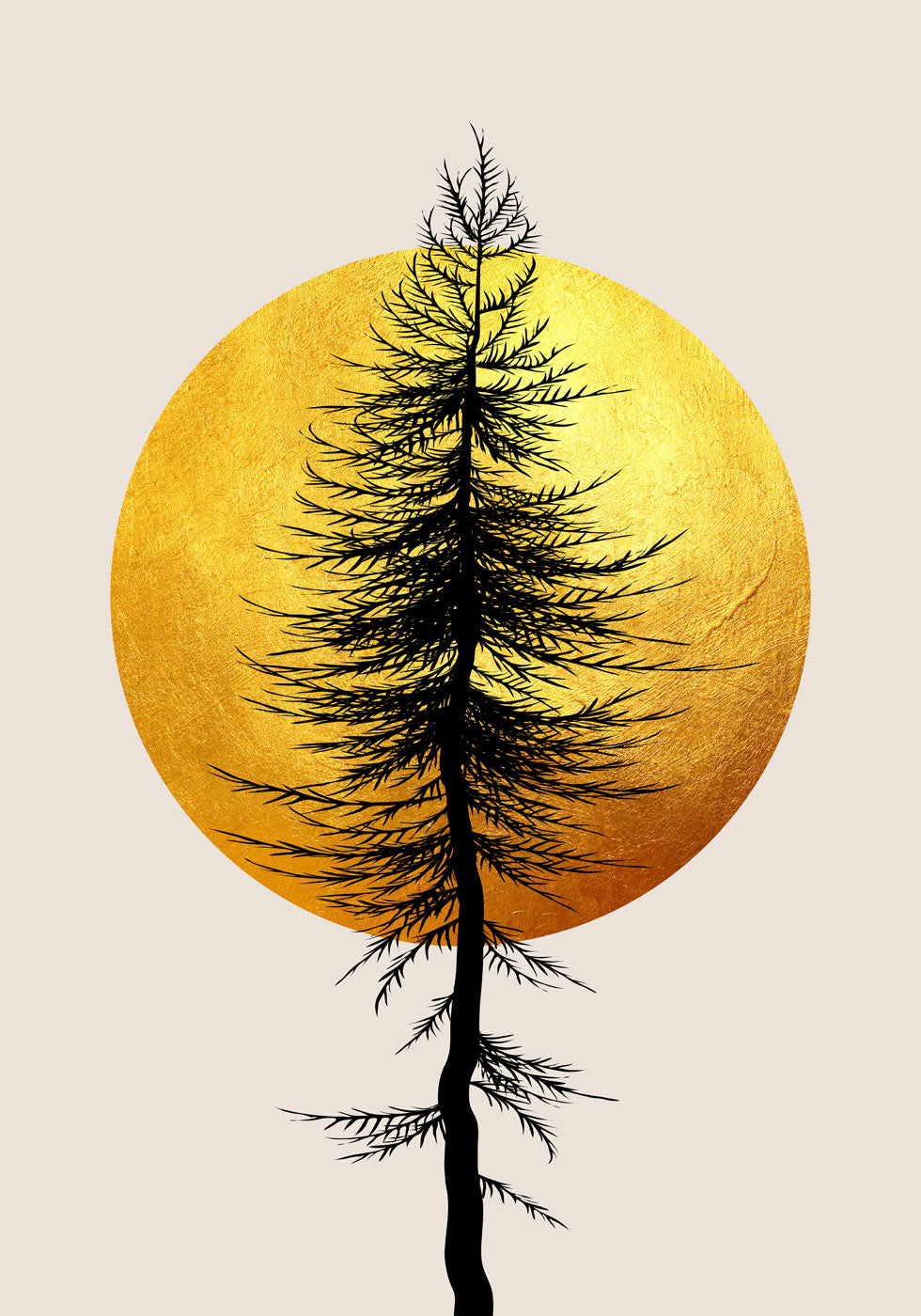 Une composition minimaliste accrocheuse avec un arbre noir se découpant sur un brillant soleil doré. Le fond doré texturé crée un beau contraste avec les branches délicates, donnant une esthétique moderne et inspirée de la nature. Parfait pour les amateurs de simplicité élégante, de décoration scandinave et de design moderne.