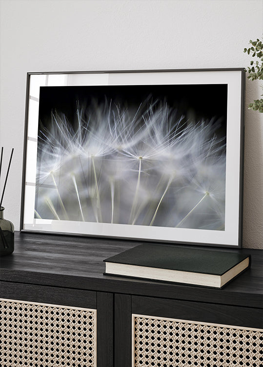 Une macrophotographie délicate de graines de pissenlit, capturant leur douceur et leur beauté plumeuses. Le gros plan met en valeur le caractère fragile et éphémère de ces touffes aériennes.