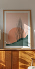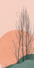Un paysage minimaliste apaisant, Sérénité au coucher du soleil capture la beauté tranquille de la nature avec une simplicité frappante. Des silhouettes d'arbres élancées et délicates se dressent sur un grand soleil orange chaud, encadrées par des collines vertes douces et vallonnées et un ciel pêche pâle. Deux petits oiseaux planent au-dessus, ajoutant un sentiment de paix et d'ouverture. La composition équilibrée et la palette de couleurs discrètes rendent cette pièce parfaite pour les intérieurs modernes, scandinaves ou d'inspiration japonaise et crée un point focal calme dans n'importe quelle pièce.