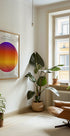 Une œuvre d'art minimaliste moderne avec un brillant dégradé circulaire inspiré des couleurs du coucher de soleil. Avec un mélange de teintes violet foncé, orange vif et dorées, ce design abstrait crée un point focal harmonieux, parfait pour les intérieurs modernes et les espaces créatifs.