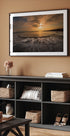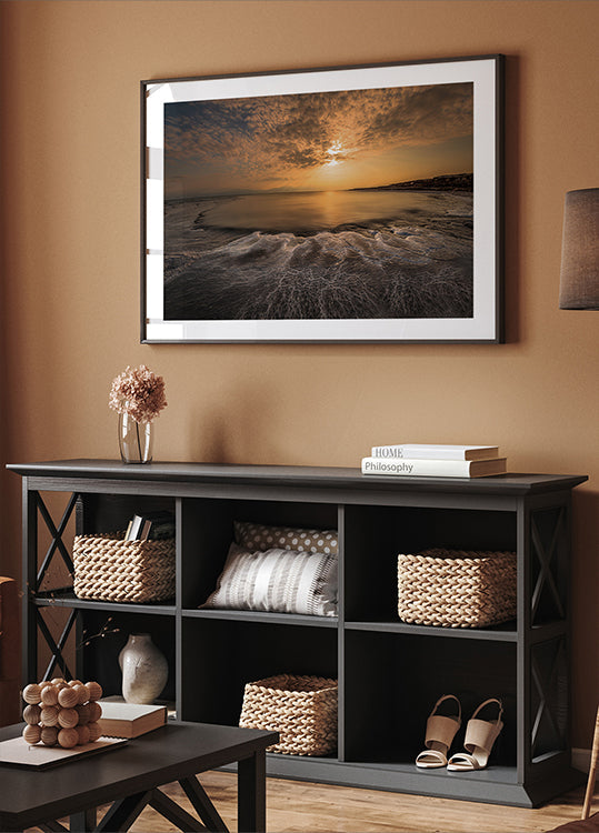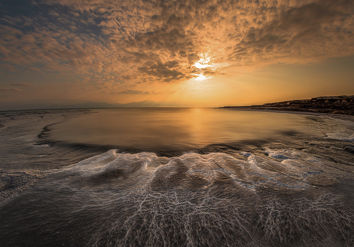 La Structure de sel d'Isam Telhami permet au rythme tranquille de la mer de remplir l'espace : de douces vagues se déferlent sur une plage de sable fin et clair, où le sel dessine des motifs subtils le long du bord de l'eau. Au-dessus de l’horizon dérivent de lourds nuages aux bleus sourds et aux couleurs sable. Un motif calme et minimaliste qui invite à la contemplation.