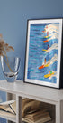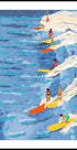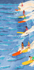 Une illustration vivante et colorée de surfeurs surfant sur les vagues sur des longboards, capturant l'énergie insouciante de l'été et de la vie marine. Avec des couleurs fortes et un mouvement dynamique, cette pièce célèbre les sports nautiques, les voyages et les loisirs et s'intègre parfaitement dans les intérieurs d'inspiration côtière ou rétro surf.