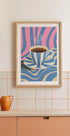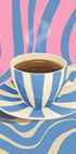 Une illustration ludique et vivante d’une tasse de café fumante dans une tasse rayée bleu et blanc avec soucoupe. Le fond rose et bleu saisissant offre une ambiance amusante d’inspiration rétro – parfait pour les cuisines, les cafés ou tous ceux qui aiment un moment de café élégant sur le mur.