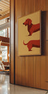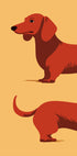 Une illustration minimaliste et ludique d'un teckel, présenté avec humour en deux parties distinctes avec le long corps étendu à travers la composition. Cette œuvre d'art moderne et distinctive capture le charme du « chien saucisse » bien-aimé et est parfaite pour les amoureux des chiens et les intérieurs modernes.