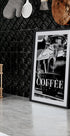 Une superbe affiche en noir et blanc avec le mot « COFFEE » combiné à un gros plan d'une machine à expresso versant du café frais dans une tasse. Parfait pour les murs de cuisine, les cafés ou les cafés, ce design typographique minimaliste combine l'inspiration avec une esthétique monochrome élégante.