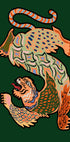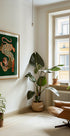 Une illustration abstraite saisissante d’un tigre stylisé aux couleurs vives, sur un fond vert vif. L’œuvre combine des motifs géométriques, des lignes fluides et des textures vibrantes pour créer une interprétation moderne de l’esprit félin. Une œuvre d’art unique inspirée des animaux pour les amateurs de design moderne.