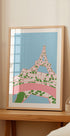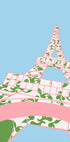 Une illustration moderne et vivante de la Tour Eiffel à Paris, décorée de motifs floraux verts ludiques sur des lignes rose tendre sur un ciel bleu clair. Cette œuvre d'art donne une touche fraîche, féminine et élégante à l'un des monuments les plus emblématiques du monde, parfaite pour les intérieurs féminins, les espaces inspirés du voyage ou comme pièce maîtresse sur le mur.