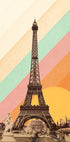 Une illustration accrocheuse d'inspiration rétro de la Tour Eiffel à Paris, sur un fond audacieux à rayures arc-en-ciel avec un chaud soleil doré. La combinaison de photographies vintage et de graphismes vibrants crée une œuvre d'art à la fois nostalgique et moderne, inspirée du voyage, parfaite pour les amoureux de Paris, d'architecture et de décoration murale colorée.