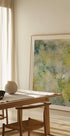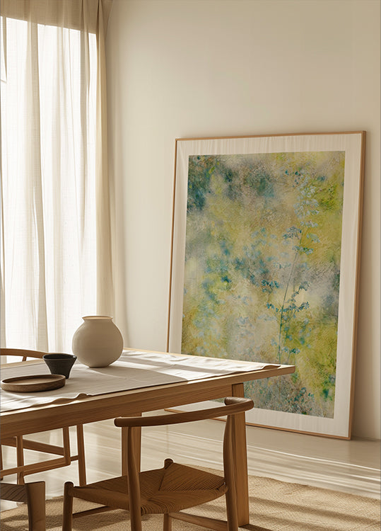 Une délicate œuvre d’art impressionniste qui mélange des formes botaniques avec des textures picturales douces. Les nuances délicates de vert, de bleu et de jaune doré créent une atmosphère onirique et paisible qui capture la beauté éphémère de la nature. Parfait pour ajouter une ambiance apaisante et artistique à n'importe quelle pièce