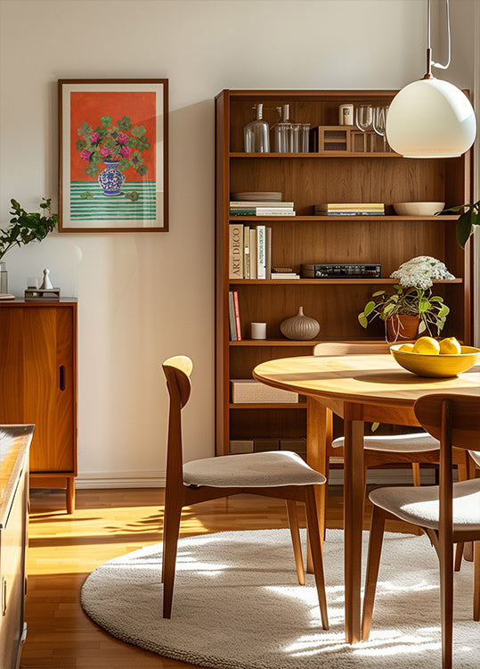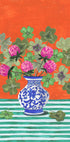 Une nature morte colorée représentant un vase en porcelaine bleue rempli de fleurs roses et de trèfles verts, sur un fond orange vif. La nappe rayée offre un contraste ludique, faisant de cette pièce une pièce décorative vivante. Parfait pour les amateurs d’art botanique et moderne.