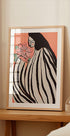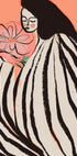 Une affiche onirique et poétique avec un portrait stylisé d'une femme enveloppée de rayures noires et blanches saisissantes, tenant délicatement une fleur. Avec son fond pêche doux et ses lignes expressives, l'œuvre allie romantisme, féminité et illustration moderne dans une expression décorative pleine de sensibilité et de charme.