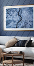 Une rivière d'un bleu glacial traverse un paysage enneigé vu du ciel, où les traces de gel tracent des lignes claires entre les arbres sombres et les étendues blanches. La palette fraîche et le rythme calme des courbes capturent l’intensité tranquille de l’hiver. Art photographique de Daniel Gastager, qui équilibre nature brute et calme poétique. Crée de la profondeur et du calme dans la pièce.