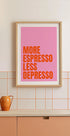 Lumineuse, audacieuse et humoristique, cette affiche typographique moderne présente l'expression ludique « More Espresso Less Depresso » en texte orange gras sur un arrière - plan rose. Une combinaison parfaite de motivation et de plaisir, idéale pour les cuisines, les bureaux ou les coins café. Parfait pour les amateurs de café avec le sens de l'humour.