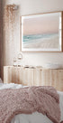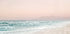 Une photographie côtière paisible qui capture des vagues turquoise se brisant doucement sur une plage de sable sous un ciel pastel brumeux. Les montagnes lointaines créent un horizon de rêve qui évoque la tranquillité et une atmosphère de vacances.