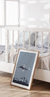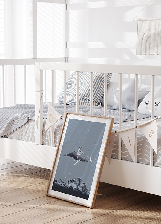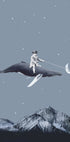 Une œuvre d'art surréaliste et imaginative représentant un garçon chevauchant une baleine dans un ciel étoilé tout en contrôlant le croissant de lune avec un bâton. Au-dessus des montagnes enneigées, cette composition de rêve capture l'émerveillement de l'enfance, l'imagination et l'imagination sans limites – parfaite pour les chambres d'enfants et les intérieurs ludiques.